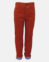 Orange, cotton twill fabric smart trousers with a chambray turn up and trim details. Pockets to front and back and an adjustable waist to ensure a trim fit.