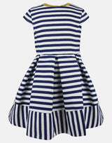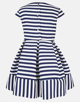 A striking navy and white stripe structured, occasion dress in our signature silhouette. This capped sleeve dress has a zip back fastening for easy changing. Our stripe fabric is set with contrasting directions for a stunning effect. The box pleated skirt has a navy lining and our extraordinarily full skirts.