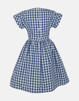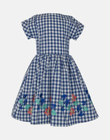The Dorothy blue check dress has embroidery to the skirt bottom to match the floral print which is unique to Little Lord & Lady and to this season, creating a limited edition dress. A neat, fitted, round neck top and turn up short sleeves give this dress a certain British style. Flowing into a gathered skirt, the petticoats are full for twirlability and fun. Fully lined for comfort, the dress is finished with a full button back for easy changing. The bright floral embroidery is a pink, yellow or blue flower in keeping with the story colourway . A striking dress, is sold with a matching knotted headband.
