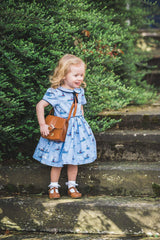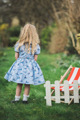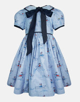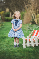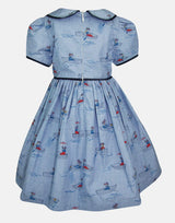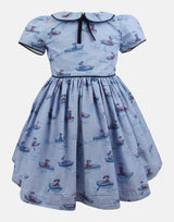 The boat print is unique to Little Lord & Lady and to this season, creating a limited edition dress in 100% cotton chambray. A neat fitted body with sweet puff sleeves, a Peter Pan collar and navy tie give the dress lots of British style. The gathered skirt has lashings of white net underskirts offer twirlability and fun. Fully lined for comfort, the dress is finished with navy piping to collar edge, waist and cuffs for contrast. The boat print is a navy, sky blue and red sketch of a water scene in keeping with the story colourway. A beautiful dress, simple and sweet.