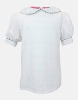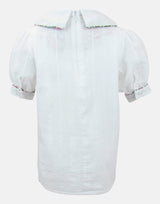 A gorgeous textured white fabric for this round collared blouse. The collar and sleeve cuffs are piped in the ditsy print and it is finished with complementary buttons. With cuffed puff sleeves creating a classic silhouette, this blouse is fully lined for comfort and has a zip fastening to the back for easy changing.